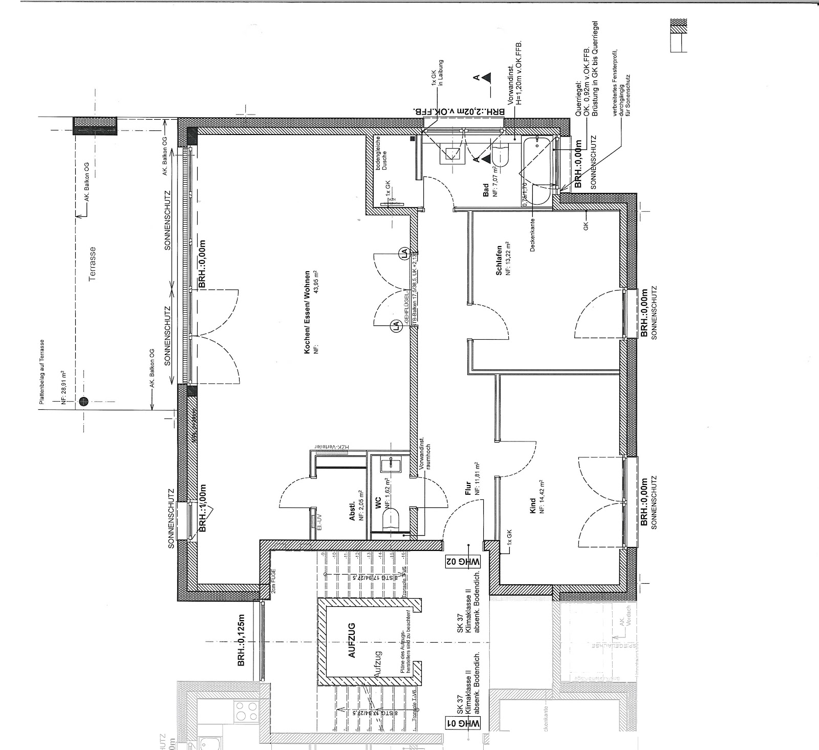 Die Wohnfläche von knapp 100 m² verteilt sich, gem. des gezeigten Grundrisses, auf, den Flur einen sehr großen Wohn-/Koch-/Essbereich, zwei Schlafzimmer, einen kleinen Abstellraum, einen sehr großen, überdachten Balkon, das Badezimmer und ein Gäste-WC.